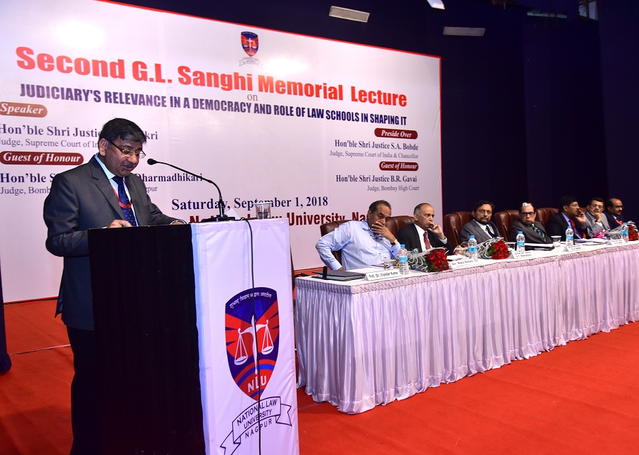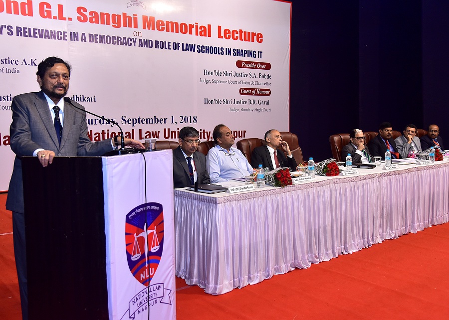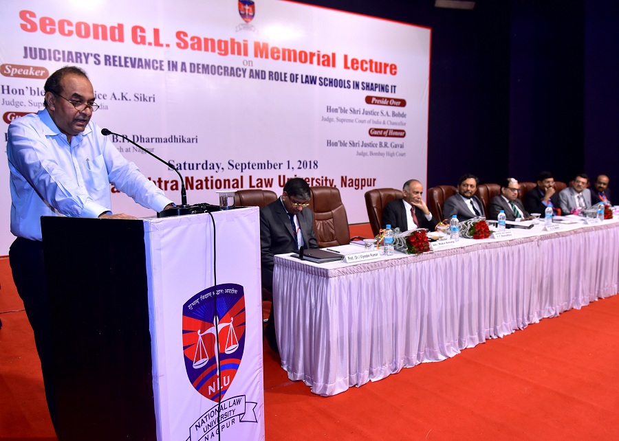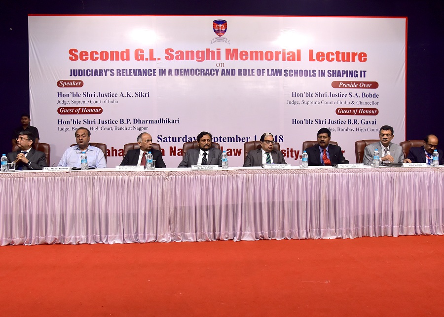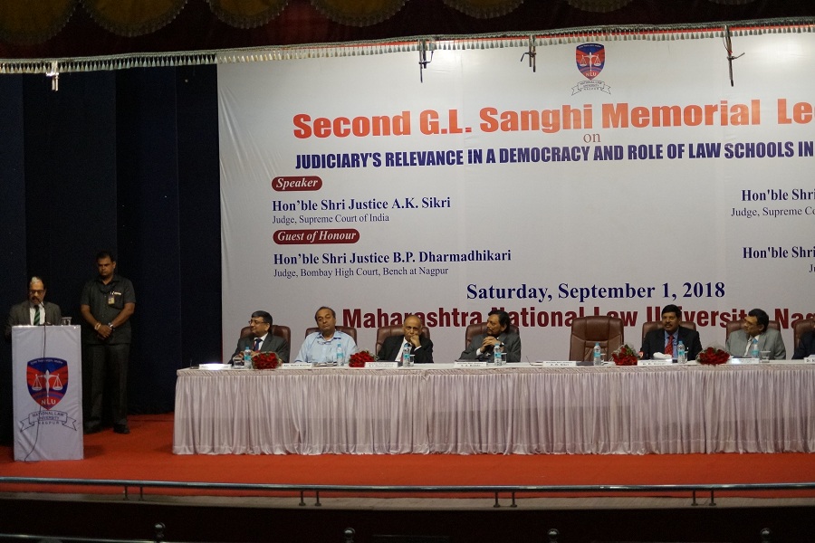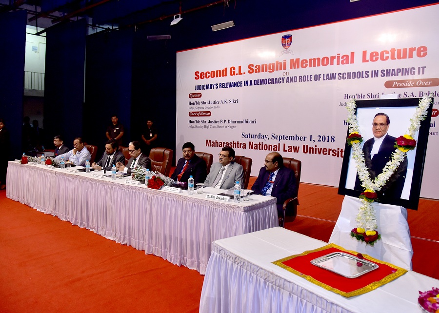 The Maharashtra National Law University, Nagpur organized the ‘Second G.L. Sanghi Memorial Lecture’ on September 1, 2018 at Dr. Vasantrao Deshpande Hall, Civil Lines, Nagpur. The Memorial Lecture was delivered by Hon’ble Shri Justice, A.K. Sikri, Judge, Supreme Court of India on the Topic “Judiciary’s Relevance in a Democracy and Role of Law Schools in shaping it”. Hon’ble Shri Justice S.A. Bobde, Judge, Supreme Court of India and Chancellor of the University presided over the function. Hon’ble Shri Justice B.R. Gavai, Judge, Bombay High Court, Hon’ble Shri Justice B.P. Dharmadhikari, Judge, Bombay High Court Bench at Nagpur, Hon’ble Shri Justice Vipin Sanghi, Judge, Delhi High Court and Shri Mukul Rohatgi, Former Attorney General and Designated Senior Advocate were the Guest of Honour’s. The lecture was instituted by the family members of Late Shri G.L. Sanghi, Senior Advocate, Supreme Court of India.