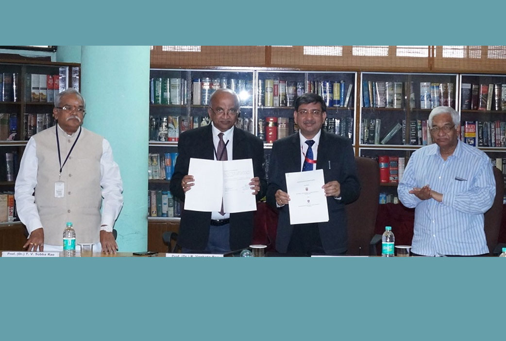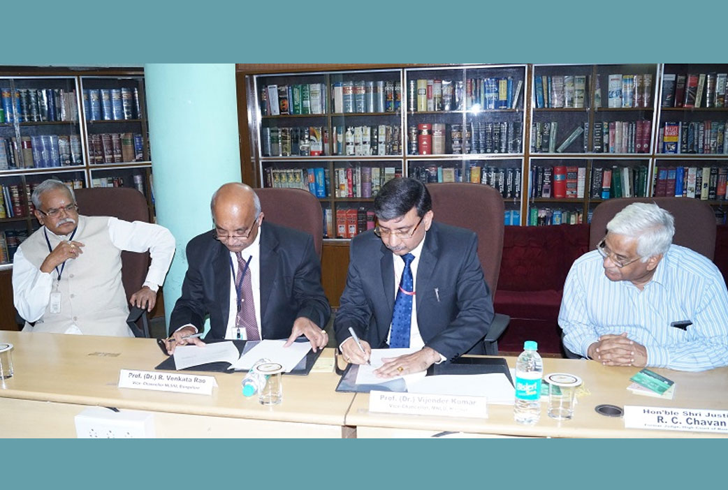 The Maharashtra National Law University, Nagpur signed a Memorandum of Understanding (MoU) with National Law School of India University (NLSIU), Bangalore on December 7, 2016 for fostering academic collaboration between the two universities. This MoU facilitates MNLU, Nagpur to operationalize its vision and mission of ensuring academic collaboration that will encompass exchange of students and members of faculty between the two universities; collaborate in mutual agreeable academic events, teaching, training and research; offer full time as well as optional courses to the undergraduate and postgraduate degree courses offered at these universities on mutually agreeable terms and conditions; supervise Ph.D. Scholars in interdisciplinary areas of research having interface with law; and initiate other academic activities, research and publication. In addition to this, active efforts will be made to develop joint training and collaborative research programmes that will be pursued in a collaborative spirit. Prof. (Dr.) Vijender Kumar, Vice-Chancellor, NLU, Nagpur and Prof. (Dr.) R. Venkata Rao, Vice-Chancellor, NLSIU, Bangaluru signed the MoU on behalf of their respective university. Prof. (Dr.) T.V. Subba Rao, Senior Professor of Law from NLSIU, Hon’ble Mr. Justice R.C. Chavan, Former Judge, Bombay High Court, Dr. N.M. Sakarkar, Registrar, MNLU, Prof. (Dr.) Naresh Kumar Vats, Dr. Himanshu Pandey, Dr. V.P. Tiwari, Mr. Ramesh Kumar C.,OSD (Academics) and other faculty members of NLU, Nagpur were also present on the occasion.